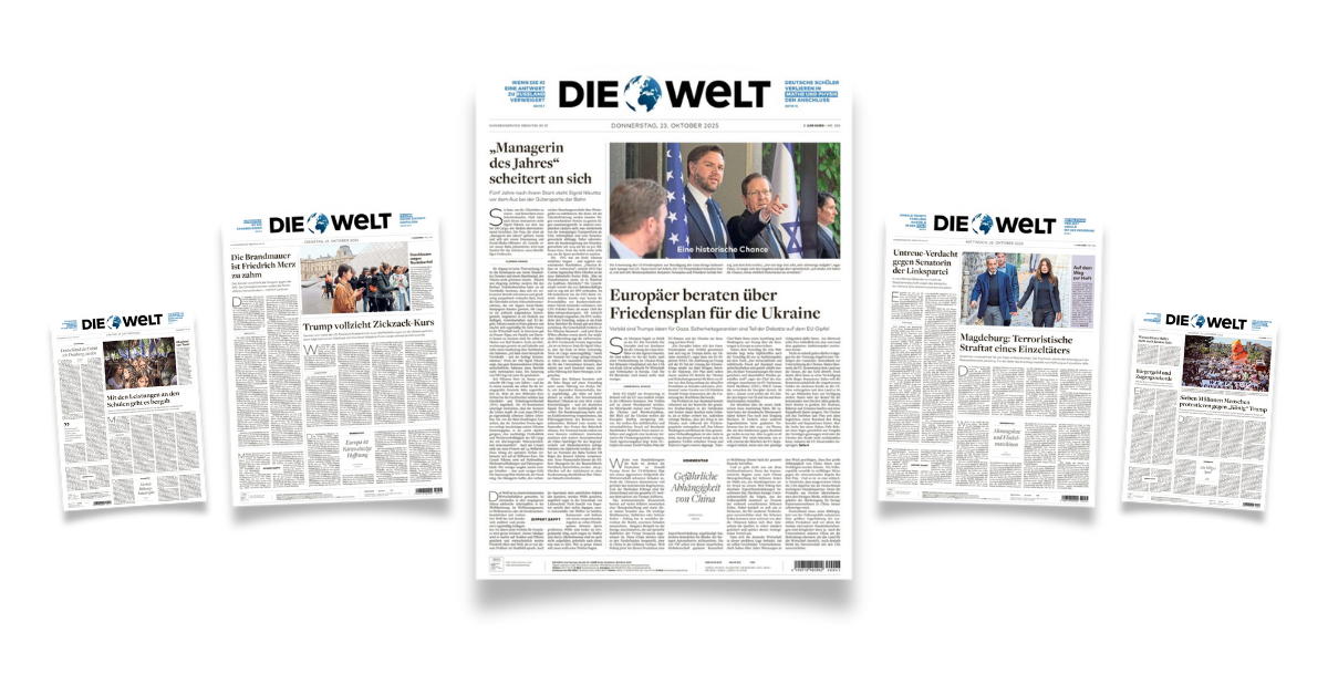 DIE WELT ist Deutschlands überregionale Tageszeitung für alle, die Zusammenhänge verstehen und Entwicklungen einordnen wollen. Jede Ausgabe steht für fundierte Analysen, exklusive Recherchen und meinungsstarke Perspektiven auf Politik, Wirtschaft, Gesellschaft und Kultur – unabhängig, faktenbasiert und mit Haltung.